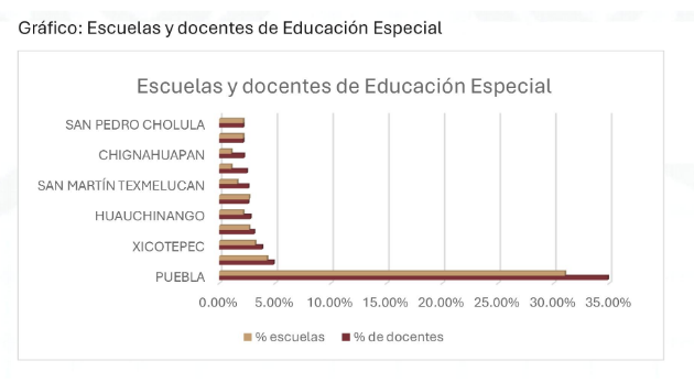 El cuadro Educación especial por entidad federativa Gracia permitiría revisar algunas entidades en lo particular. Puebla tendría con 189 escuelas de éste nivel; tan solo el 2.89% de las que prestan este servicio en la republica mexicana, y de ellas 52 (27.51%) pertenecerían a los CAMs y 137 (72.24%) corresponderían al USAER; contaría con 1 544 docentes, el 3.43% de total nacional y de ellos corresponderían 412 (26.68%) al CAM y 1 132 (73.31%) al USAER y que atenderían a 15 528 alumnos, el 2.29% del total nacional. De ellos, 2 536 (16.33%) pertenecerían al CAM y 12 992 (83.66%) al USAER.