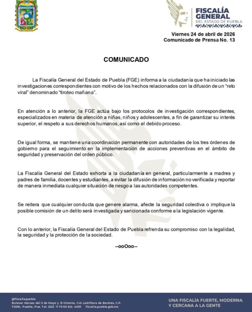 Puebla, 27 abril 2026.- Ante las amenazas de ataques armados que se difundieron la semana pasada en escuelas de varias entidades, las cuales se presume son fomentadas por un reto viral de TikTok llamado “Mañana Tiroteo”, las Secretarías de Educación Pública de los estados de Puebla, Tlaxcala, Veracruz y Nuevo León ya trabajan para prevenir este tipo de incidentes.
