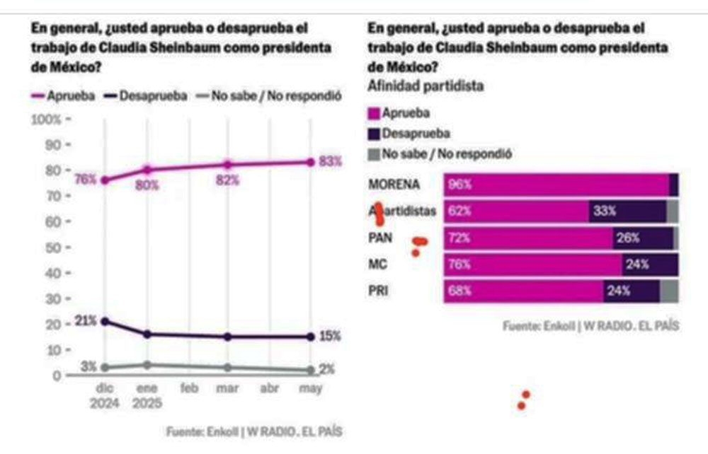 Duro golpe se llevaron los opositores al gobierno de la Cuarta Transformación (4T) este lunes 26 de mayo: conforme a la agencia Enkoll la popularidad de la presidenta Sheinbaum sigue escalando para situarse ahora en 83%; es decir, aumentó en 7 puntos porcentuales de diciembre de 2024 a mayo de 2025. Esto la hace ser el presidente con mayor aceptación que ha tenido el país a lo largo de estos últimos 50 años, superando incluso al expresidente Andrés Manuel López Obrador, quien obtuvo un índice de aceptación de 80% en septiembre de 2024, considerando los resultados de la misma encuestadora.