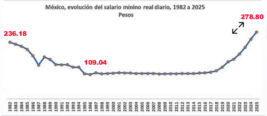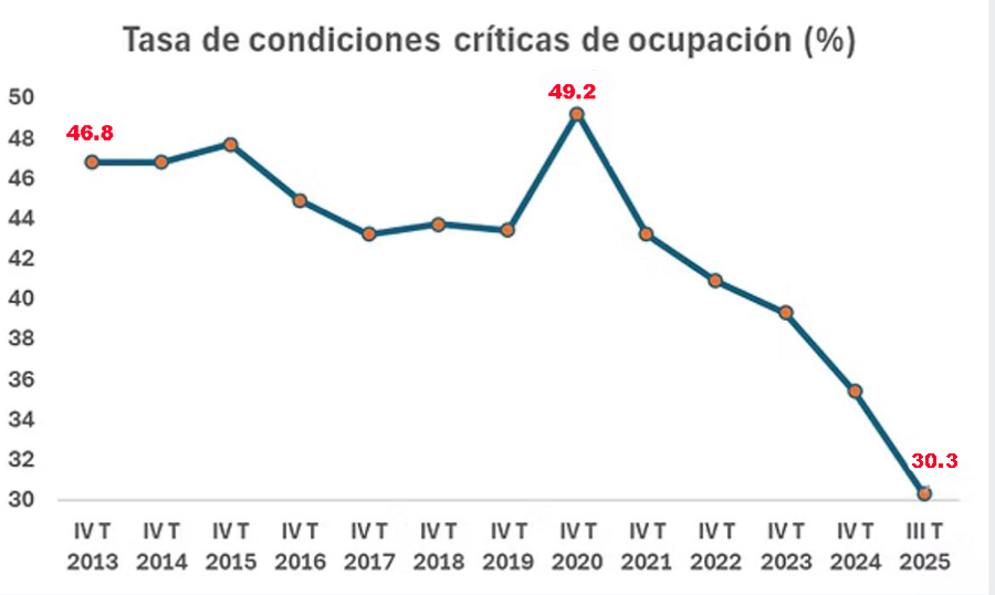 A partir de la tremenda parálisis sanitaria de 2020 y hasta el tercer trimestre de 2025, se registran datos sobresalientes: incremento acumulado del salario mínimo real de 80% y del salario promedio real cotizado en el IMSS de 21%; disminución de la tasa de desocupación, que en septiembre de 2025 se ubicó en 3%; y descenso en casi 20 puntos porcentuales de la tasa de condiciones críticas de ocupación. Quedan otros retos que enfrentar, sobre todo, el de la corrección de la tasa de informalidad que en el tercer trimestre de 2025 alcanzó un índice de 54.9%.